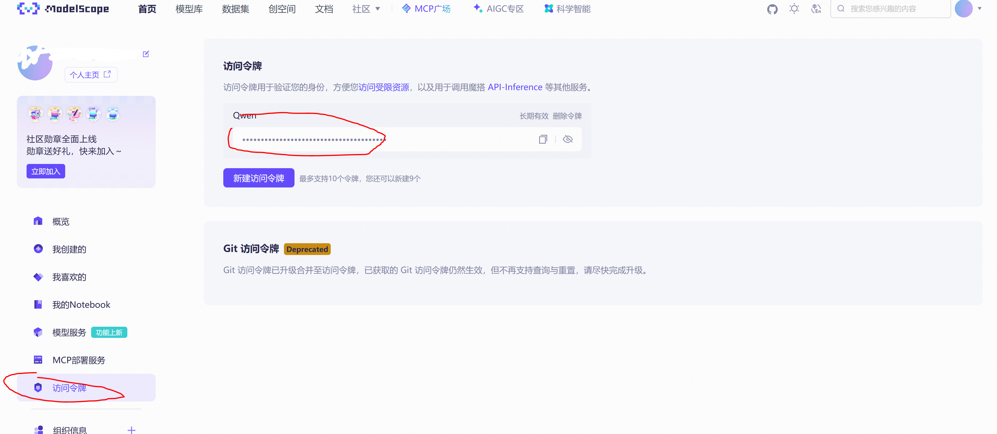 https://modelscope.cn/ 注册账号要绑定阿里云,之后访问令牌创建新的令牌,copy令牌后续使用。