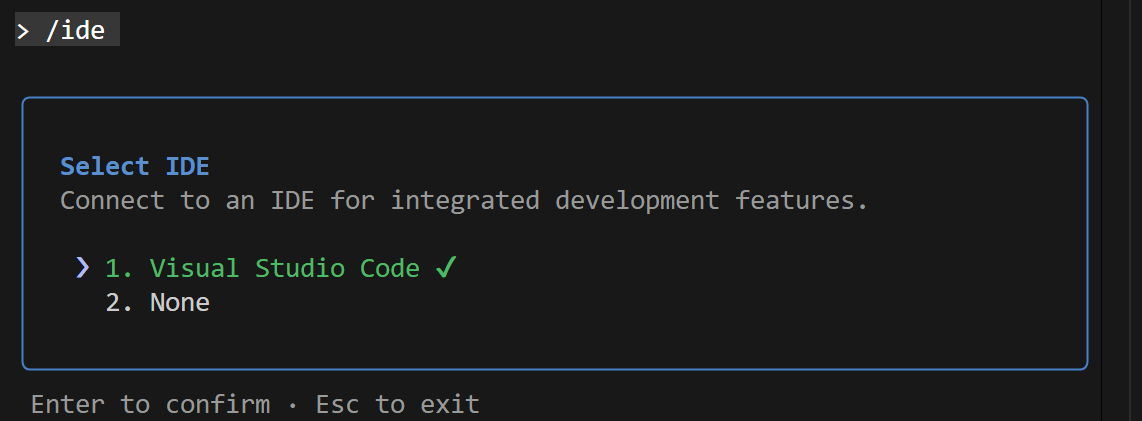 如果想在 vscode里面,可以最简单的方式,打开 Terminal,运行 ccr code,输入 /ide也可以看到和vscode连接。