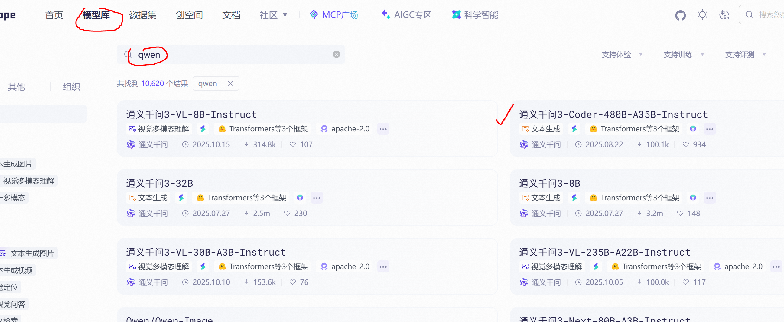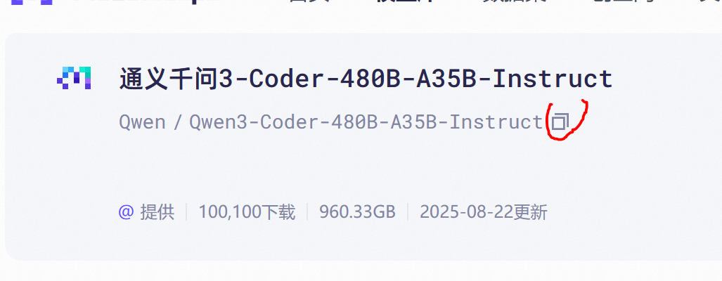 切换到 模型库,搜索qwen,找到想要使用的模型,这里我用的 qwen3-coder-480b-a35b-instruct,点进模型后 复制模型的ID留作后续配置使用。