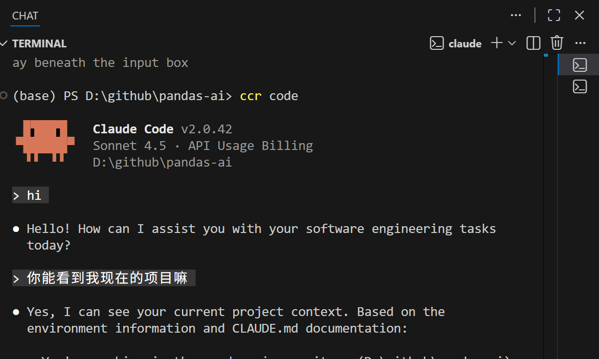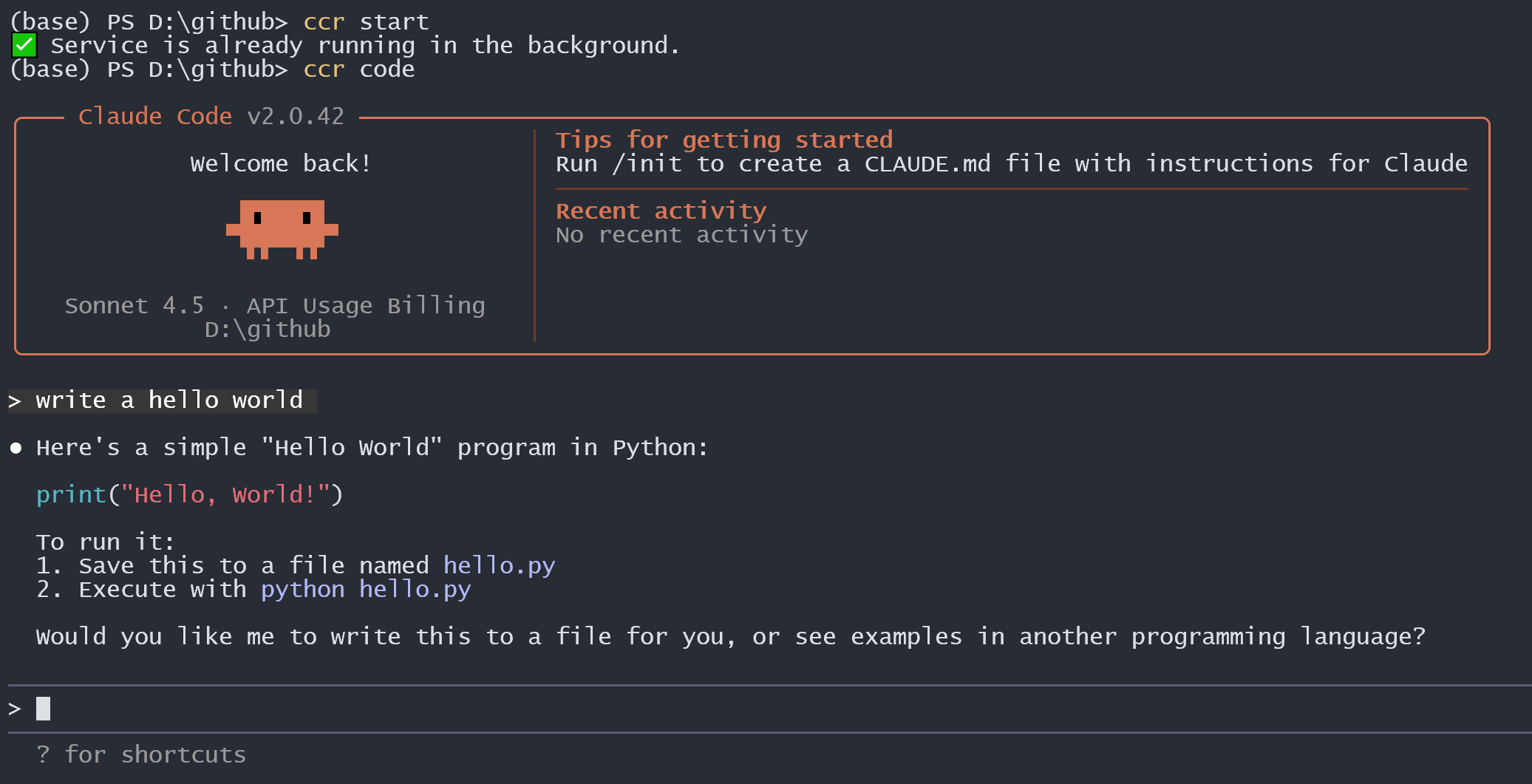 命令行运行 ccr code即可,写一个 hello world 测试一下:
