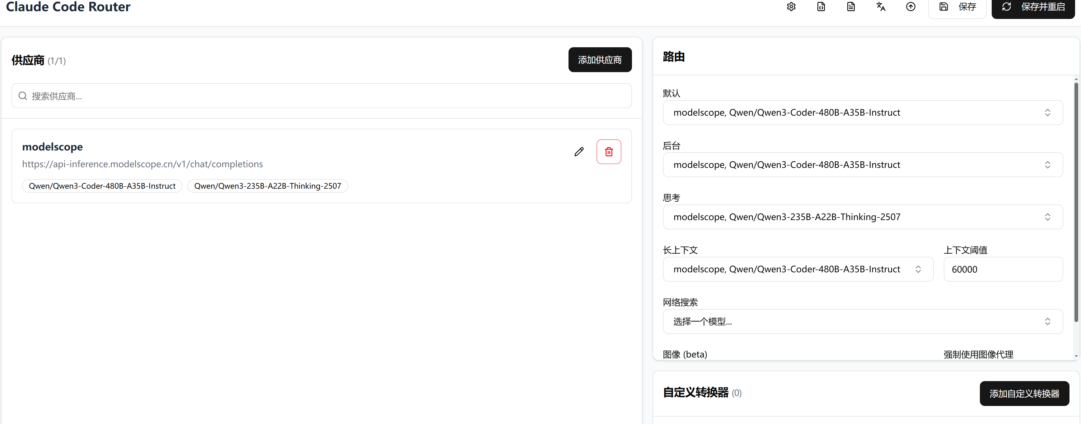 {"LOG": true,"Providers": [{"name": "modelscope","api_base_url": "https://api-inference.modelscope.cn/v1/chat/completions","api_key": "ms-xxx","models": ["Qwen/Qwen3-Coder-480B-A35B-Instruct","Qwen/Qwen3-235B-A22B-Thinking-2507"],"transformer": {"use": [["maxtoken",{"max_tokens": 65536}],"enhancetool"],"Qwen/Qwen3-235B-A22B-Thinking-2507": {"use": ["reasoning"]}}}],"Router": {"default": "modelscope,Qwen/Qwen3-Coder-480B-A35B-Instruct"},"CUSTOM_ROUTER_PATH": ""