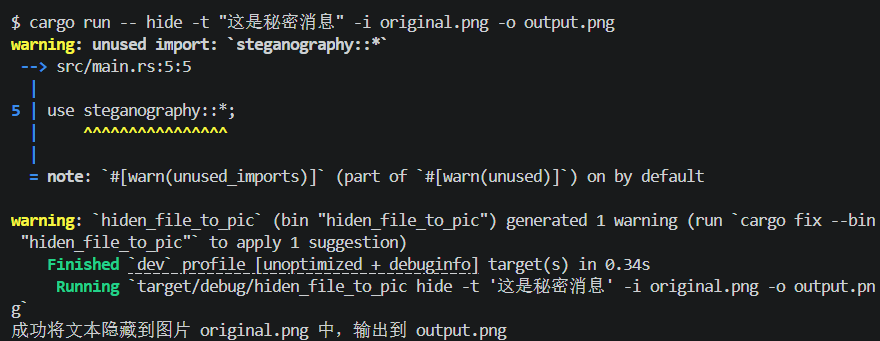 $ cargo run -- hide -t "这是秘密消息" -i original.png -o output.png