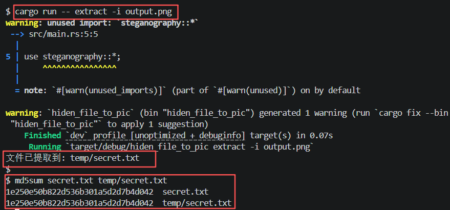 如上图所示,我们成功从output.png中提取出了隐藏在其中的文件。通过md5对比确认提取的文件与源文件一致。