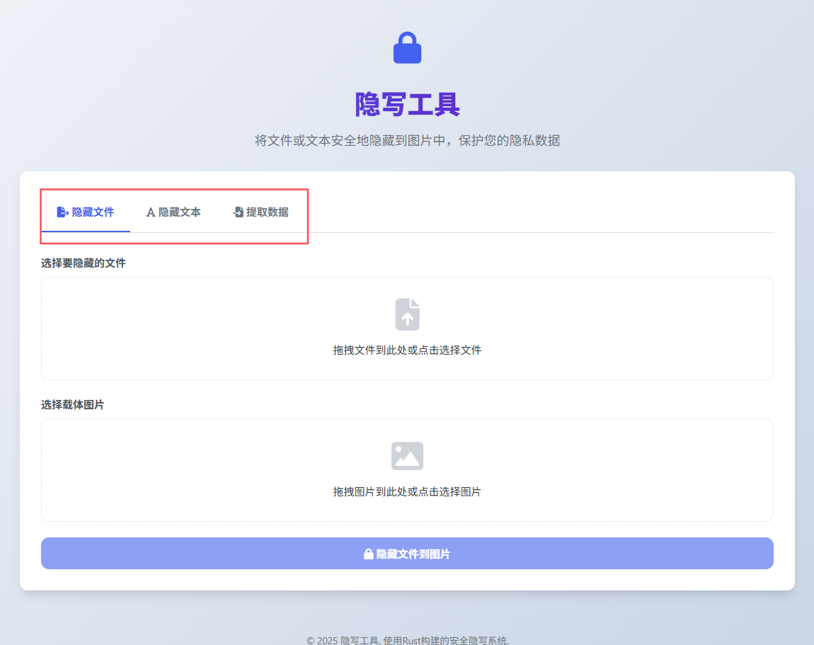三合一功能面板:通过标签页切换隐藏文件、隐藏文本和提取数据三种功能。