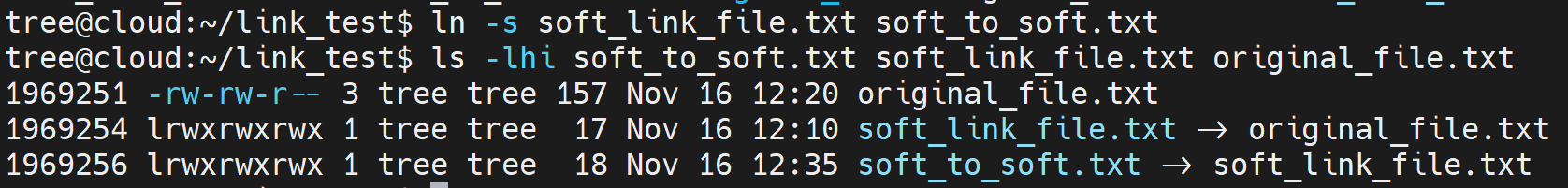 ln -s soft_link_file.txt soft_to_soft.txtls -lhi soft_to_soft.txt soft_link_file.txt original_file.txt