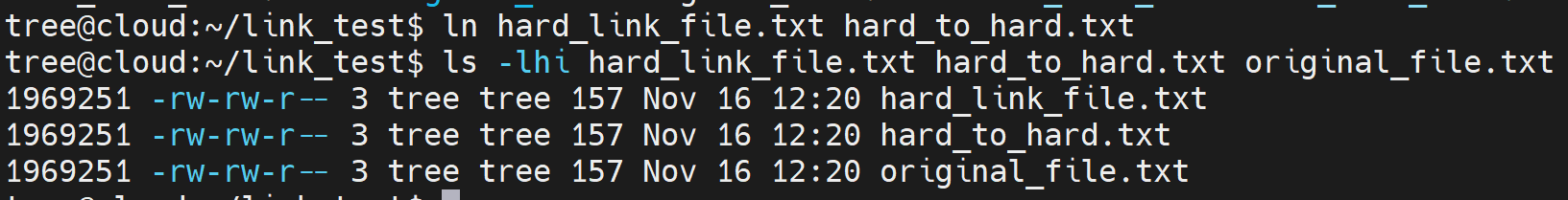 ln hard_link_file.txt hard_to_hard.txtls -lhi hard_link_file.txt hard_to_hard.txt original_file.txt