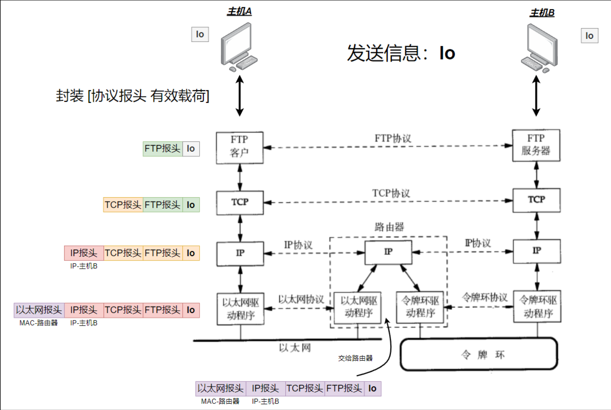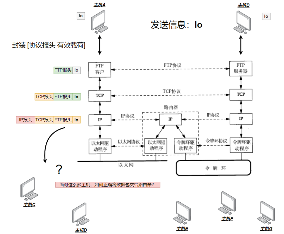IP报头,规划该数据包的路径,得知需要将此数据包交给 主机B,加上 令牌环报头 后把数据包丢入令牌环网络中,等待 主机B 截取不仅是主机需要解包,路由器等中间设备也需要具备解包能力,因为路径规划依赖于