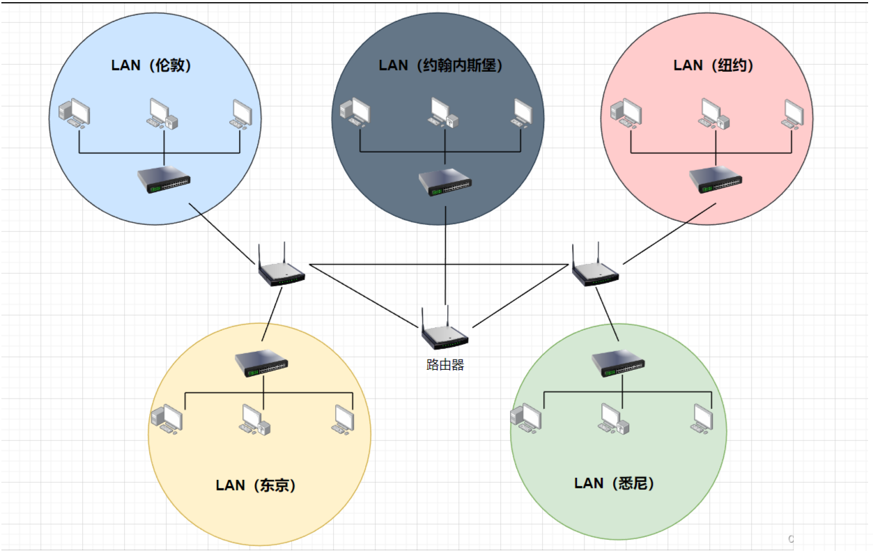 - 局域网 LAN : 通常指在一个区域内将多台计算机通过双绞线、同轴电缆等连接介质互相连接