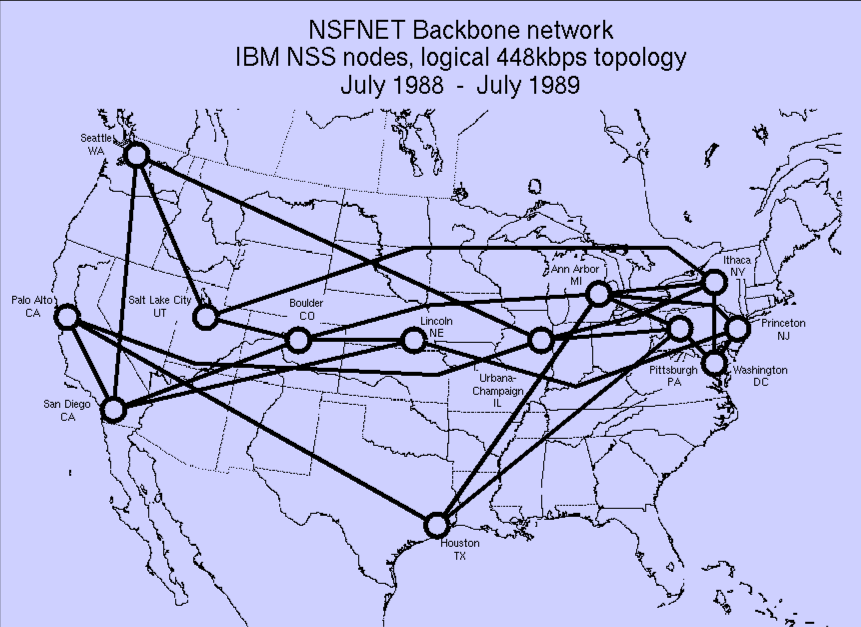 1974 年,温顿·瑟夫 和 罗伯特·卡恩 提出的 TCP/IP 协议 正式发表,TCP/IP 协议 突破了不同硬件间的限制,允许不同的计算机之间进行高效可靠的数据传输,经过数十年的完善,TCP/IP 协议 成为使用最广泛的网络协议,这也为网络快速发展奠定了基础;1986 年,美国国家科学基金会网络(NSFNET) 成立,阿帕网 只能用于军事研究,而 NSFNET 则是鼓励大学和研究机构加入到自己的互联网中,服务于学术研究,NSFNET 快速发展,并逐渐替代了 阿帕网