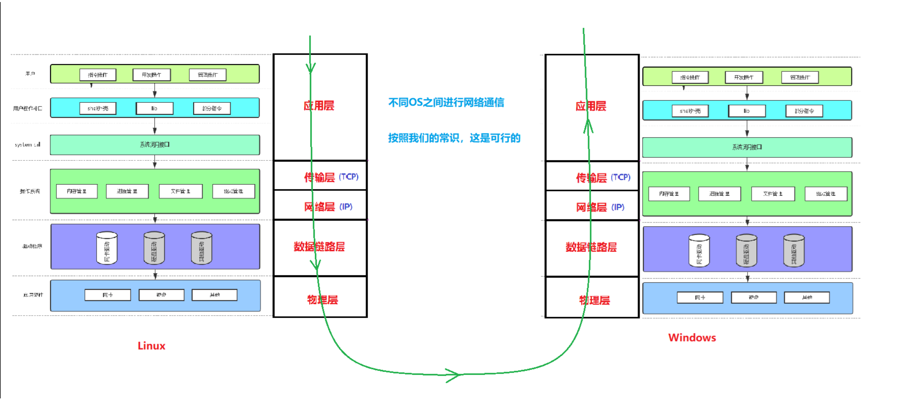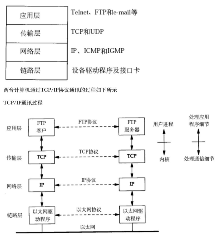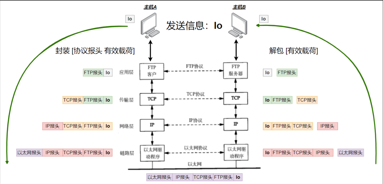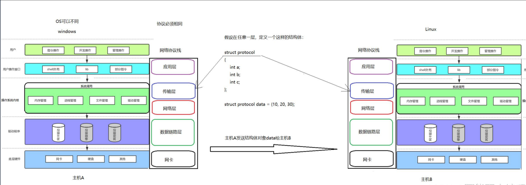 前面我们说了,TCP/IP协议属于内核中的一部分,而每一层封装的报头,实际上就是计算机网络协议的结构化数据报头。说人话就是结构体。两台计算机通过tcp/ip协议通讯的过程如下: