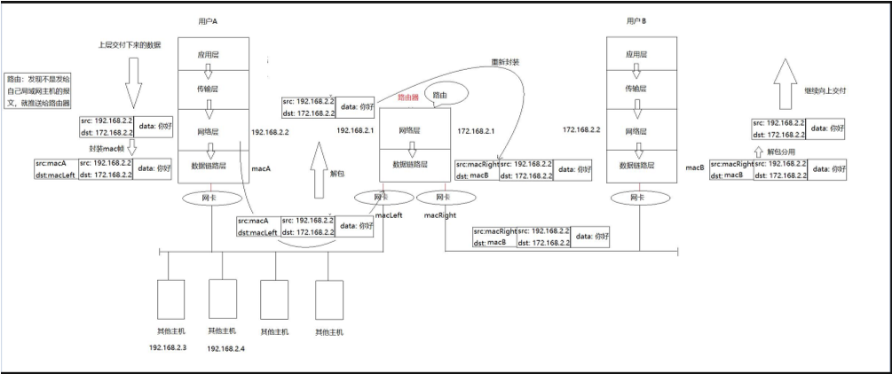 于是对端主机B就可以收到对应的数据了,因为通信双方遵守相同的TCP/IP协议,所以由路由器转发的数据在主机B也是可以看懂的,在经过一层层的解包和分用,最终把信息呈现给了用户B。