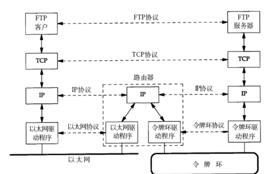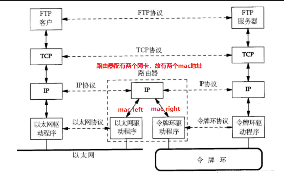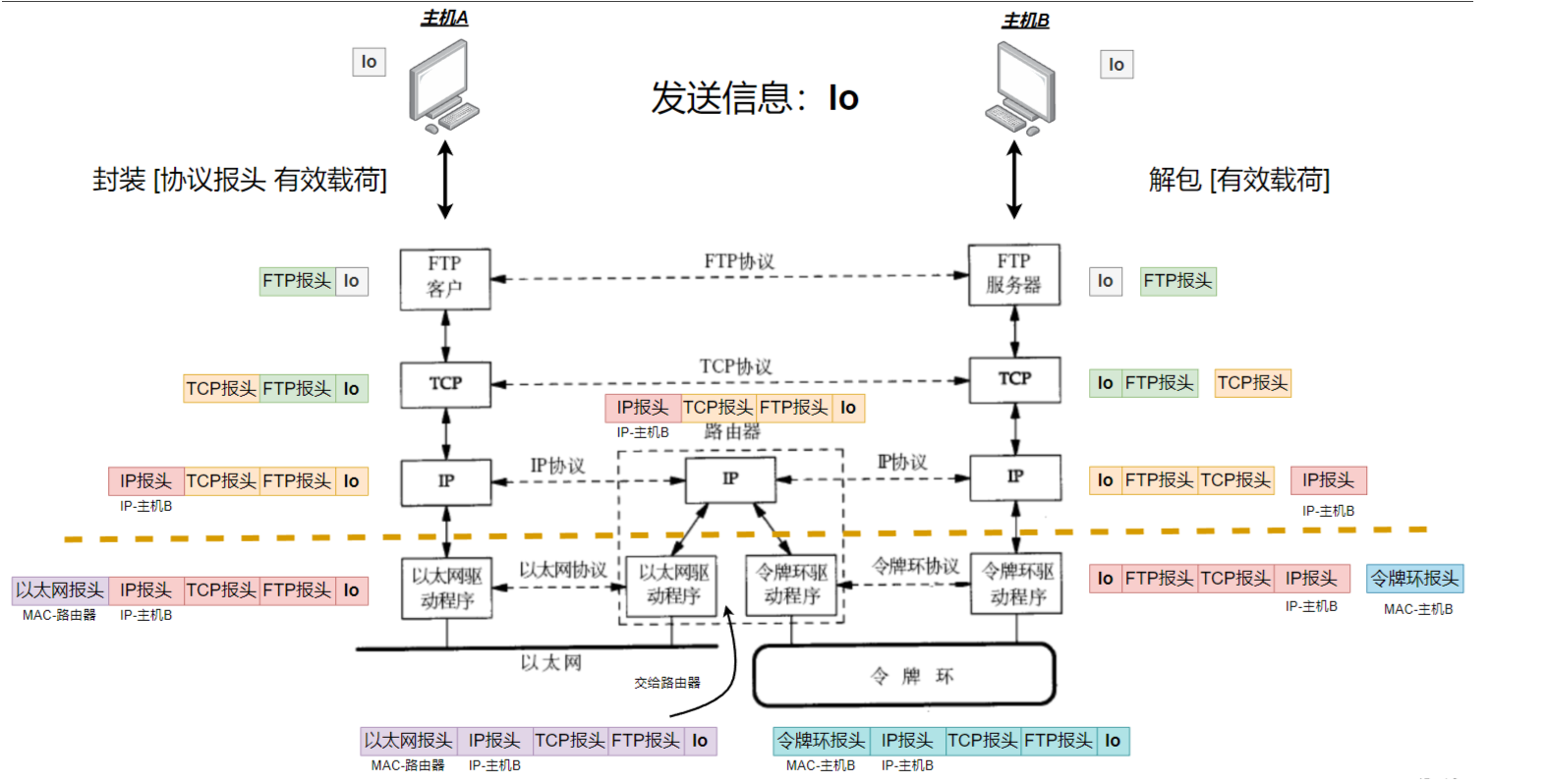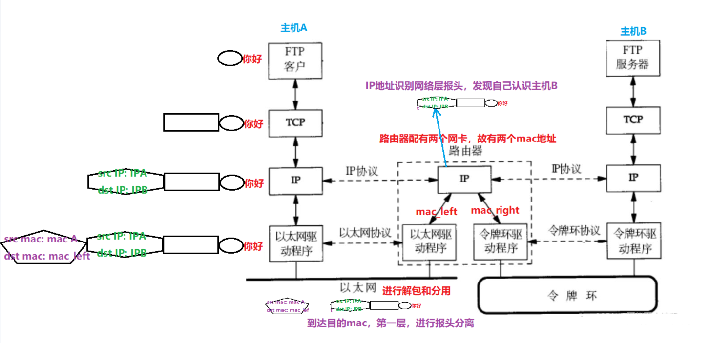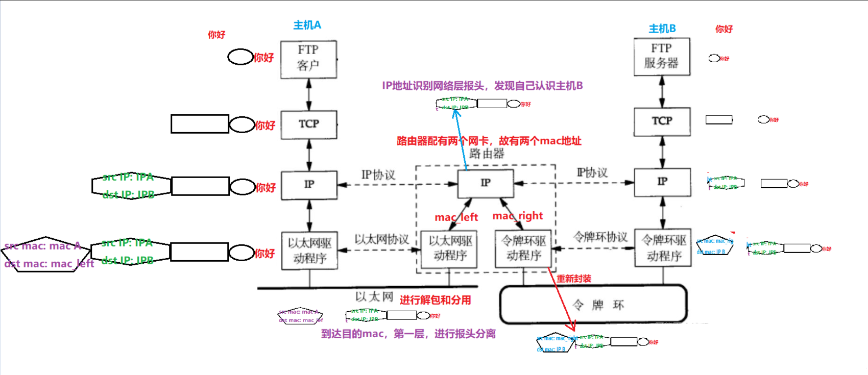 实际上IP层往上,双方的协议并没有任何的不同,而IP层往下就有差别了,上面例子中,第一次封装的是以太网的数据报头,发送给了路由器,而路由器发送给对端B时,却变为了令牌环网的数据报头。