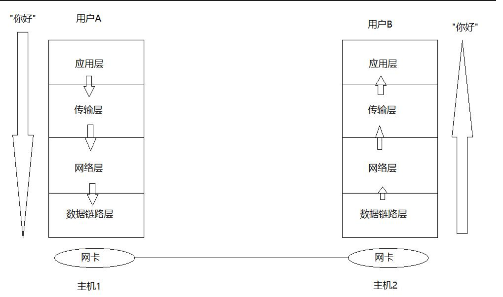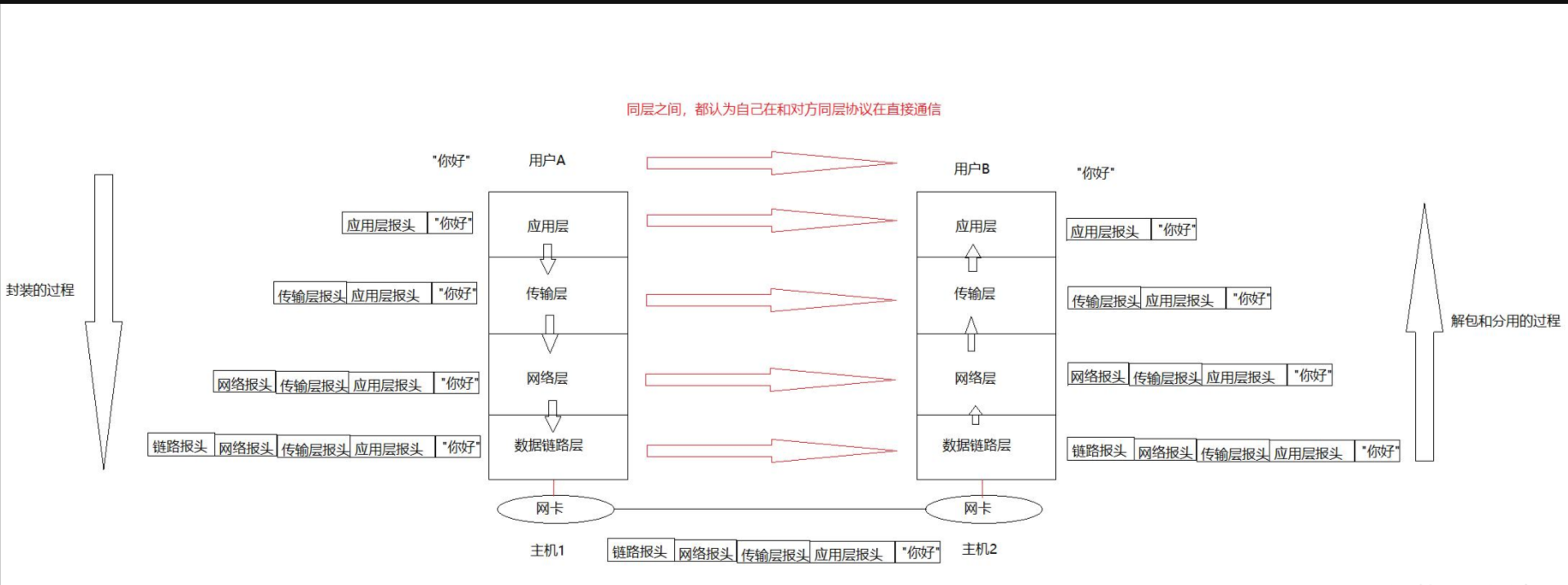 - 在逻辑上,同一层中使用的都是同一个协议,都认为自己在于对端直接通信