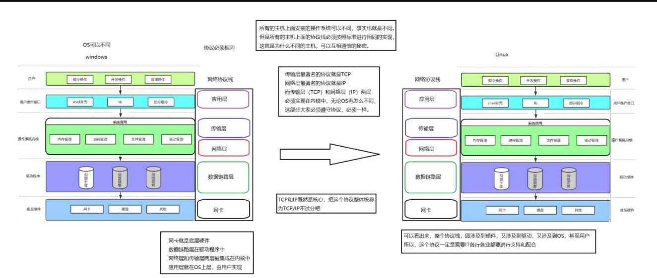 - 操作系统作为硬件与协议的桥梁,管理网络资源并实现协议,支撑通信运行;