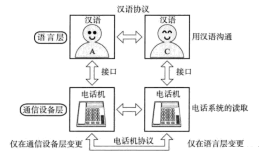 假设某天 通信设备层 中的电话机坏了,可以将其更换为无线电,继续向 语言层 提供通话的服务,即便设备更换了,