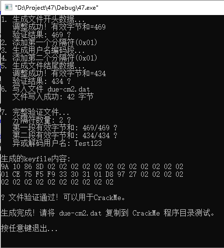 int main() {printf("=========================================\n");srand((unsigned int)time(NULL));unsigned char keyfile_data[100];size_t data_position = 0;int success_flag = 1;// 1. 生成文件开头数据(到第一个0x01之前)printf("1. 生成文件开头数据...\n");int header_length = 10 + rand() % 10; // 10-19字节unsigned char header_section[20];for (int h = 0; h < header_length; h++) {header_section[h] = generate_safe_byte();keyfile_data[data_position++] = header_section[h];}// 调整这部分数据的有效字节和为469if (adjust_checksum_exclude_separators(header_section, header_length, 469)) {// 更新调整后的数据到keyfilefor (int u = 0; u < header_length; u++) {keyfile_data[data_position - header_length + u] = header_section[u];}printf("调整成功!有效字节和=469\n");// 验证调整结果int verified_sum = calculate_valid_sum(keyfile_data, header_length);printf("验证结果: %d %s\n", verified_sum, verified_sum == 469 ? "?" : "?");} else {printf("调整失败!\n");success_flag = 0;}if (success_flag) {// 2. 添加第一个分隔符printf("2. 添加第一个分隔符(0x01)\n");keyfile_data[data_position++] = 0x01;// 3. 生成异或编码的用户名段printf("3. 生成用户名编码段...\n");const char* username = "Test123";int username_length = strlen(username);// 关键修正:使用文件开头的字节作为异或密钥for (int c = 0; c < username_length && c < header_length; c++) {keyfile_data[data_position++] = username[c] ^ header_section[c];}// 4. 添加第二个分隔符printf("4. 添加第二个分隔符(0x01)\n");keyfile_data[data_position++] = 0x01;// 5. 生成文件结尾数据(第二个0x01之后)printf("5. 生成文件结尾数据...\n");int footer_length = 8 + rand() % 10; // 8-17字节unsigned char footer_section[20];int footer_start = data_position;for (int f = 0; f < footer_length; f++) {footer_section[f] = generate_safe_byte();keyfile_data[data_position++] = footer_section[f];}// 调整这部分数据的有效字节和为434if (adjust_checksum_exclude_separators(footer_section, footer_length, 434)) {// 更新调整后的数据到keyfilefor (int v = 0; v < footer_length; v++) {keyfile_data[footer_start + v] = footer_section[v];}printf("调整成功!有效字节和=434\n");// 验证调整结果int footer_sum = calculate_valid_sum(keyfile_data + footer_start, footer_length);printf("验证结果: %d %s\n", footer_sum, footer_sum == 434 ? "?" : "?");} else {printf("调整失败!\n");success_flag = 0;}}if (success_flag) {// 6. 写入文件printf("6. 写入文件 due-cm2.dat\n");FILE* file_pointer = fopen("due-cm2.dat", "wb");if (file_pointer) {size_t bytes_written = fwrite(keyfile_data, 1, data_position, file_pointer);fclose(file_pointer);if (bytes_written == data_position) {printf("文件写入成功: %d 字节\n", data_position);// 7. 完整验证生成的文件printf("\n7. 完整验证文件...\n");// 查找分隔符位置int separator_count = 0;int separator_positions[2] = {-1, -1};for (size_t s = 0; s < data_position; s++) {if (keyfile_data[s] == 0x01) {if (separator_count < 2) {separator_positions[separator_count] = s;}separator_count++;}}printf("分隔符数量: %d %s\n", separator_count, separator_count == 2 ? "?" : "?");// 验证第一段(到第一个0x01)int sum_first = 0;if (separator_positions[0] != -1) {for (int a = 0; a < separator_positions[0]; a++) {if (keyfile_data[a] != 0x00 && keyfile_data[a] != 0x01) {sum_first += keyfile_data[a];}}}printf("第一段有效字节和: %d/469 %s\n", sum_first, sum_first == 469 ? "?" : "?");// 验证第二段(第二个0x01之后)int sum_second = 0;if (separator_positions[1] != -1) {for (size_t b = separator_positions[1] + 1; b < data_position; b++) {if (keyfile_data[b] == 0x00 || keyfile_data[b] == 0x01) break;sum_second += keyfile_data[b];}}printf("第二段有效字节和: %d/434 %s\n", sum_second, sum_second == 434 ? "?" : "?");// 验证异或解码if (separator_positions[0] != -1 && separator_positions[1] != -1) {printf("异或解码用户名: ");for (int d = separator_positions[0] + 1, e = 0; d < separator_positions[1] && e < header_length; d++, e++) {unsigned char decoded_char = keyfile_data[d] ^ keyfile_data[e];printf("%c", (decoded_char >= 32 && decoded_char <= 126) ? decoded_char : '?');}printf("\n");}// 显示文件内容printf("\n生成的keyfile内容:\n");for (size_t p = 0; p < data_position; p++) {printf("%02X ", keyfile_data[p]);if ((p + 1) % 16 == 0) printf("\n");}printf("\n");if (sum_first == 469 && sum_second == 434 && separator_count == 2) {printf("\n? 文件验证通过!可以用于CrackMe。\n");} else {printf("\n? 文件验证失败!\n");success_flag = 0;}} else {printf("错误: 文件写入不完整\n");success_flag = 0;}} else {printf("错误: 无法创建文件\n");success_flag = 0;}}if (success_flag) {printf("\n生成完成!请将 due-cm2.dat 复制到 CrackMe 程序目录测试。\n");} else {printf("\n生成失败!\n");}printf("\n按任意键退出...\n");getchar();return success_flag ? 0 : 1;