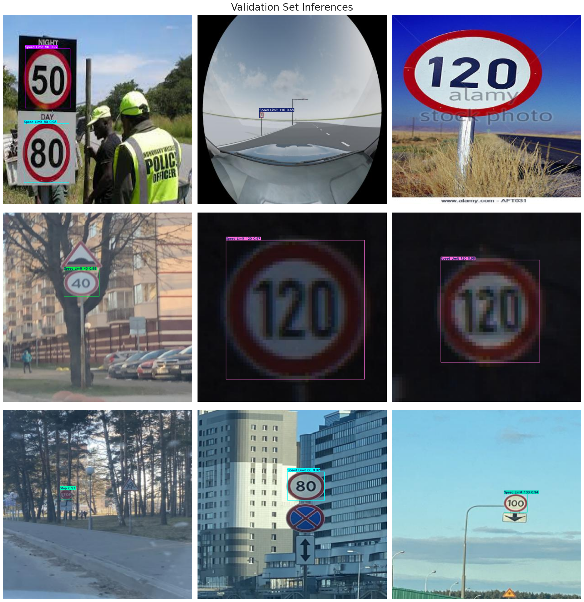 if len(image_files) > 0:# Select 9 images at equal intervalsnum_images = len(image_files)step_size = max(1, num_images // 9) # Ensure the interval is at least 1selected_images = [image_files[i] for i in range(0, num_images, step_size)]# Prepare subplotsfig, axes = plt.subplots(3, 3, figsize=(20, 21))fig.suptitle('Validation Set Inferences', fontsize=24)for i, ax in enumerate(axes.flatten()):if i < len(selected_images):image_path = os.path.join(valid_images_path, selected_images[i])# Load imageimage = cv2.imread(image_path)# Check if the image is loaded correctlyif image is not None:# Resize imageresized_image = resize_image(image, size=(640, 640))# Normalize imagenormalized_image = normalize_image(resized_image)# Convert the normalized image to uint8 data typenormalized_image_uint8 = (normalized_image * 255).astype(np.uint8)# Predict with the modelresults = Valid_model.predict(source=normalized_image_uint8, imgsz=640, conf=0.5)# Plot image with labelsannotated_image = results[0].plot(line_width=1)annotated_image_rgb = cv2.cvtColor(annotated_image, cv2.COLOR_BGR2RGB)ax.imshow(annotated_image_rgb)else:print(f"Failed to load image {image_path}")ax.axis('off')plt.tight_layout()plt.show()