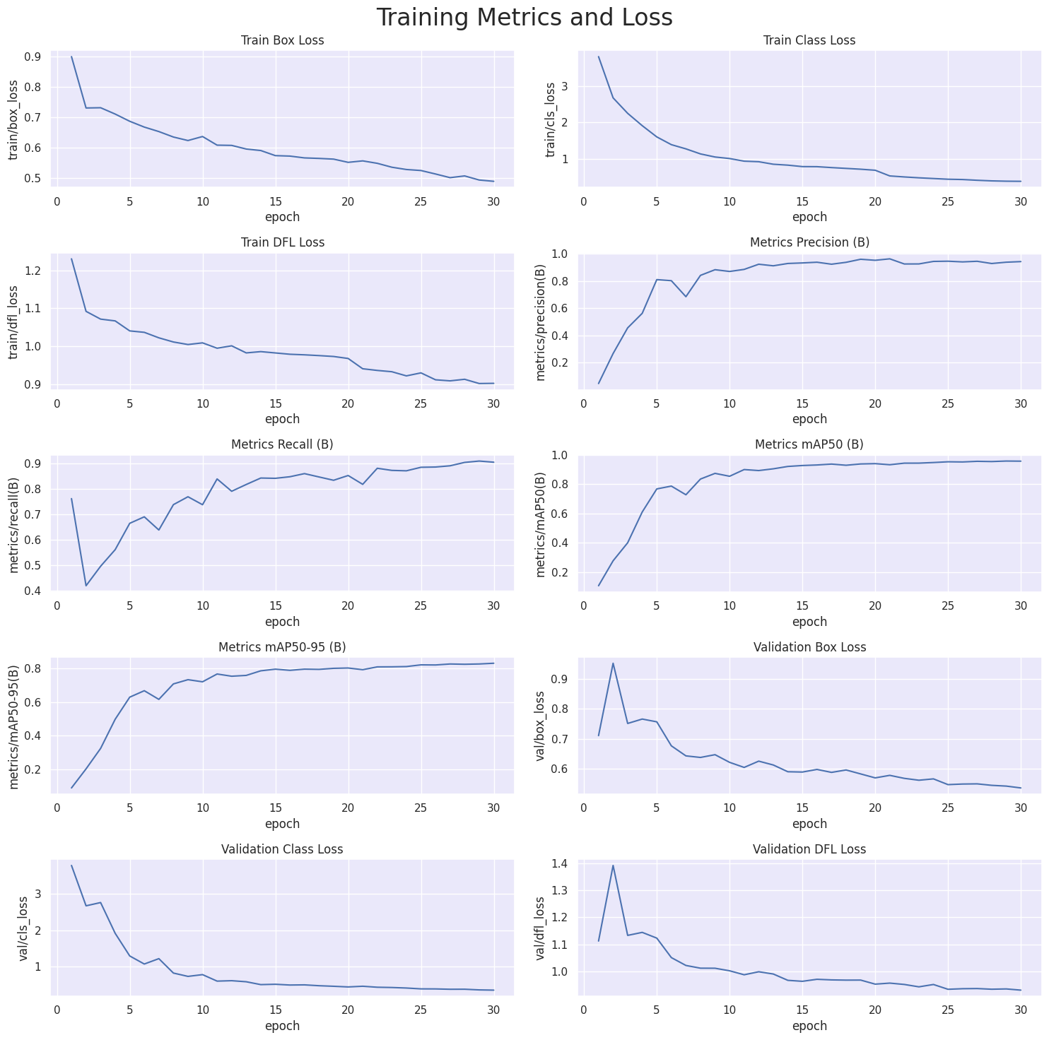 axs[4,1].set(title='Validation DFL Loss')plt.suptitle('Training Metrics and Loss', fontsize=24)
