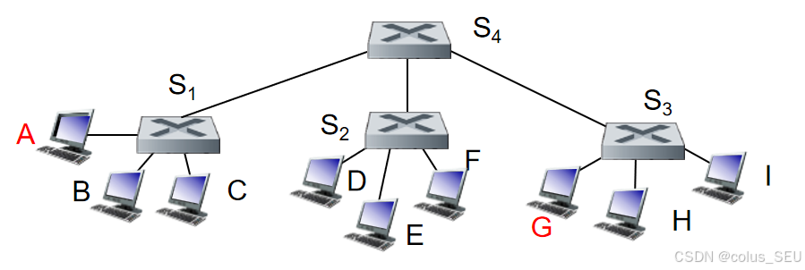 如上图,如果主机A想发送一个帧到主机G,一样可以通过自学习机制,经由交换机S1, S4, S3发送到G。