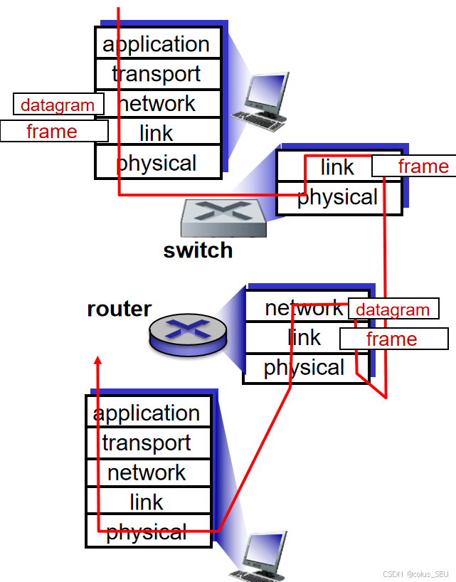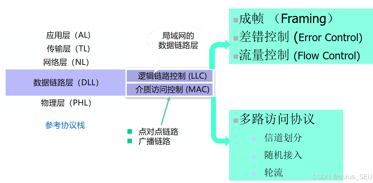 链路接入(Link Access):对于共享的广播链路(如传统的以太网),需要媒体访问控制(MAC)协议来协调多个节点如何共享信道,避免冲突。例如,CSMA/CD协议。
