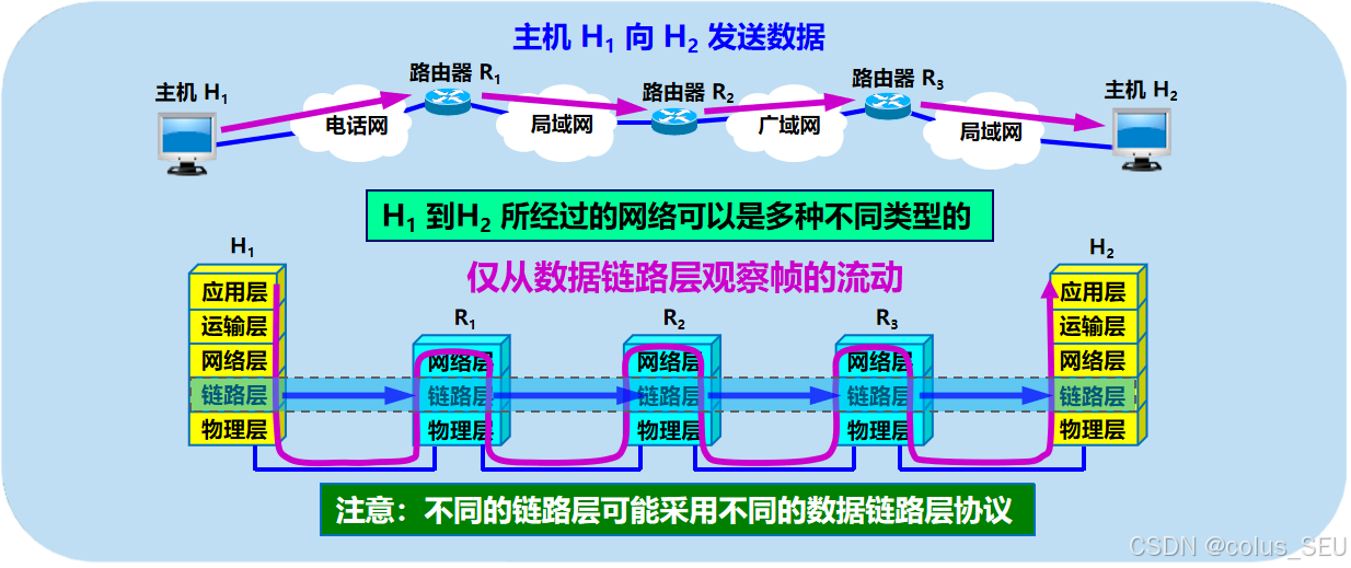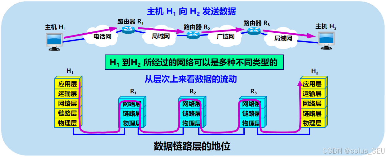 当我们学习数据链路层时,通常可以只关心协议栈中水平方向的各数据链路层。于是,当主机H1向主机H2发送数据时,可以想象数据就是在各相关设备的数据链路层之间沿水平方向传送的。如下图所示,即通过以下这样的链路:H1的链路层→R1的链路层→R2的链路层→R3的链路层→H2的链路层,其中四段不同的数据链路可能采用不同的数据链路层协议。