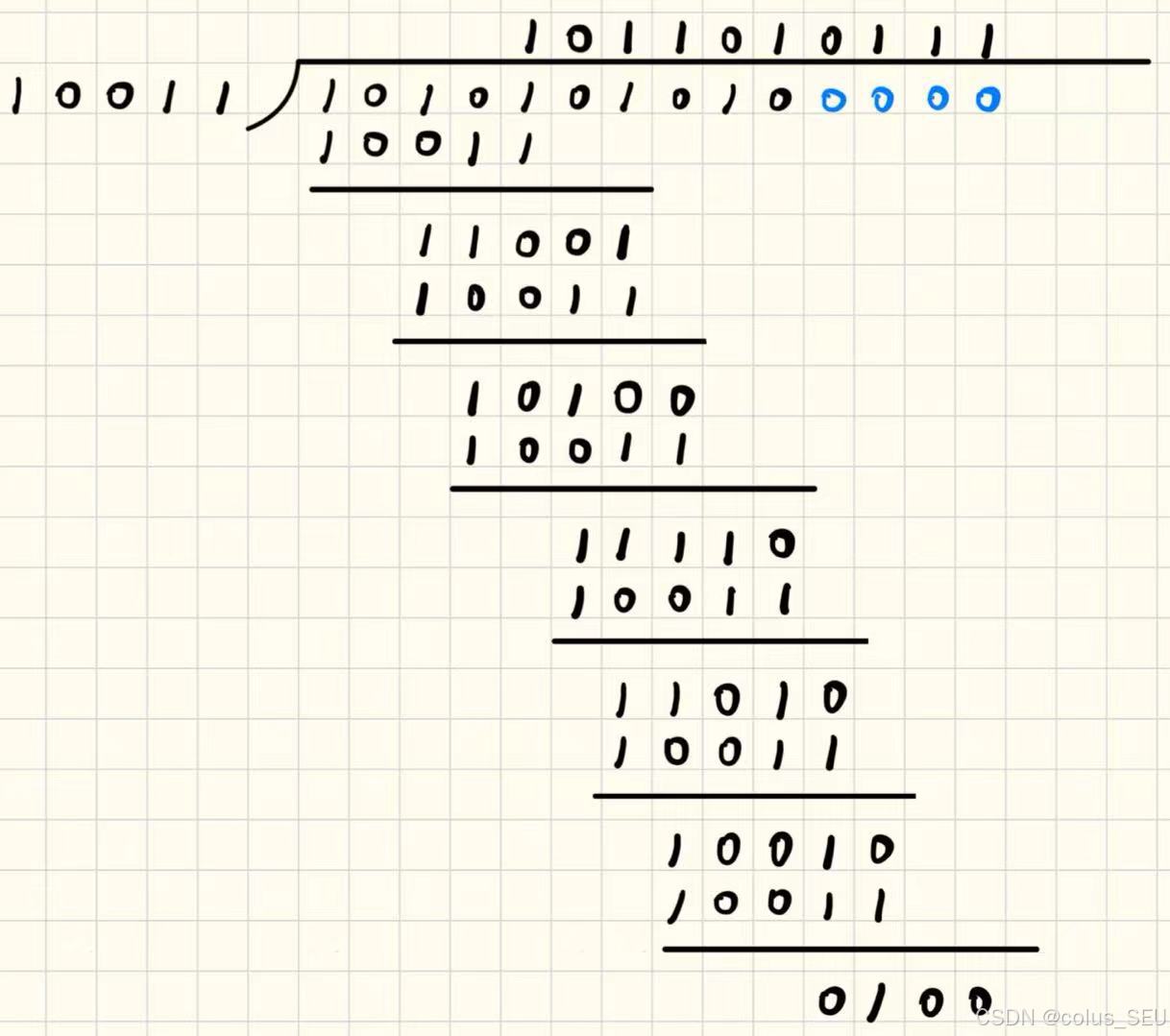 模 2 除。利用模 2 除法,用 G(x) 对应的二进制串去除 1)中计算得出的数据串,得到的余数即为冗余码(共 r 位,前面的0不可省略)。