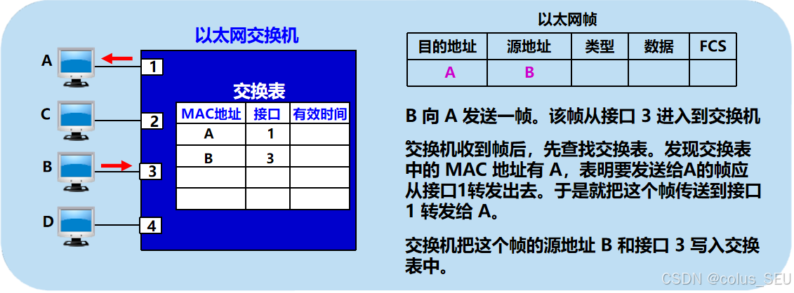 交换机是链路层设备,用于存储转发以太网帧并检查到来的帧的MAC 地址, 有选择地转发帧。