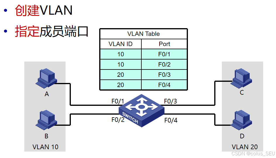 基于端口的VLAN是最简单、最有效的VLAN划分方法,它按照设备端口来定义VLAN 成员,将指定端口加入到指定VLAN中,该端口可以转发指定VLAN的数据帧。例如:将f0/1和f0/2加入VLAN 10。注意:如果成员设备离开原端口,连接到新的交换机端口,则必须重新指定端口所属的VLAN ID。