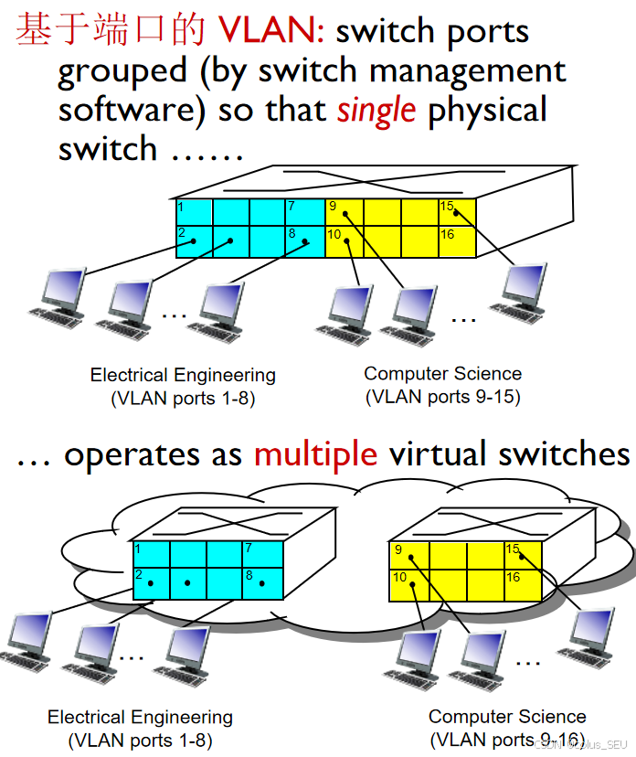 交换机支持VLAN的功能: 把物理上单个LAN划分为多个虚拟的LAN。