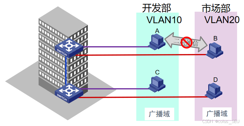 支持VLAN的交换机可以分隔广播域:一个VLAN(Virtual LAN)是一个独立的广播域;交换机通过划分VLAN,来分隔广播域。
