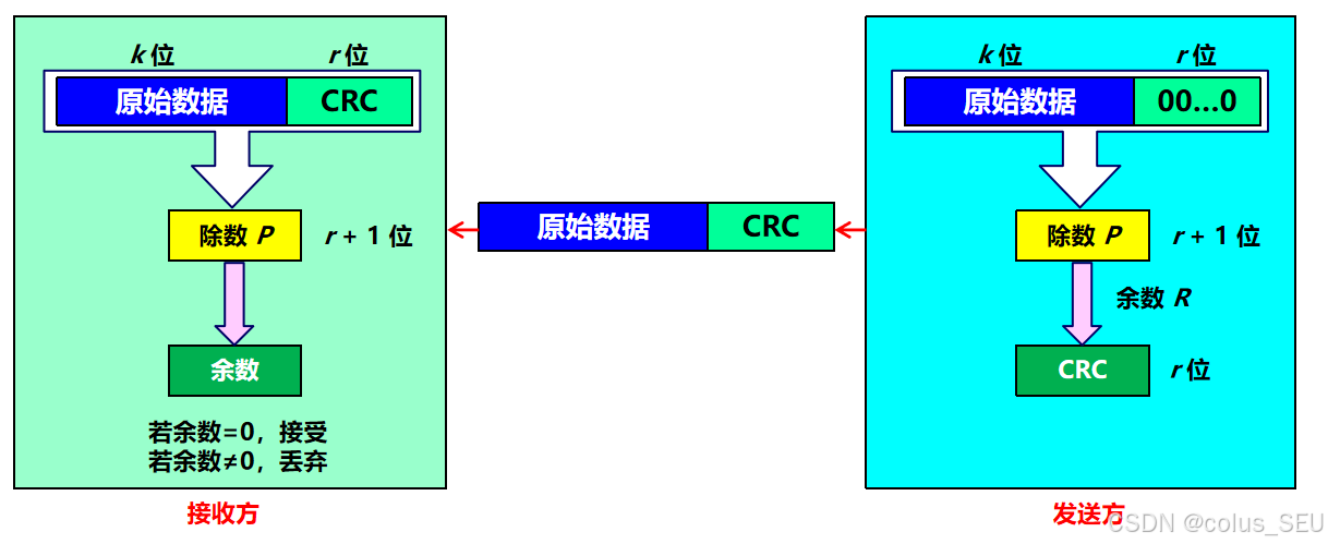 接收方收到数据和冗余码后,通过 G(x) 计算收到的数据和冗余码是否产生差错。 假设一个待传送 k 位的数据,CRC 运算产生一个 r 位的冗余码,称为帧检验序列(FCS)。这样形成的帧将由 k + r 位组成。在所要发送的数据后面增加 r 位冗余码,虽然增大了传输开销,但是可以进行差错检测,这种代价往往是值得的。这个带检验码的帧刚好能被预先确定的多项式 G(x) 整除。接收方用相同的多项式去除收到的帧,若余数为 0,则认为无差错。