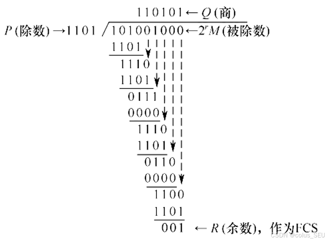 假设数据 M=101001(m=6),除数 G(x)=1101(r=3),经模 2 除法运算后的结果是:商 Q=110101(这个商没什么用),余数 R=001。因此,发送出去的数据为 101001 001(2^rM + FCS),共有 m + r 位,循环冗余码的运算过程如下图所示。