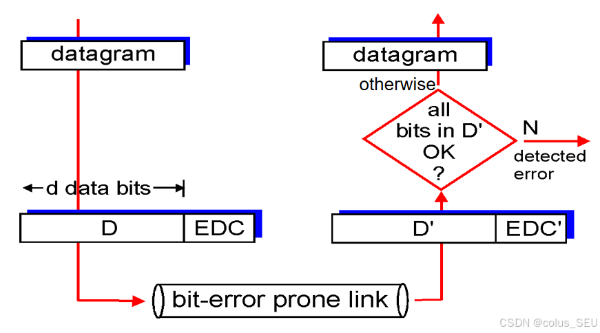 发送端:在适配器中,将网络层的数据报封装成帧,添加差错检测比特等,然后通过物理层发送。