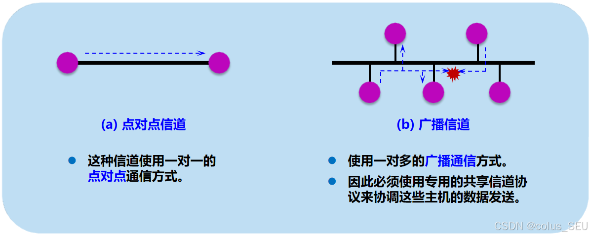 点对点链路(Point-to-Point):如两个路由器之间的专用线路,PPP协议。通信是独占的,不存在协调问题。
