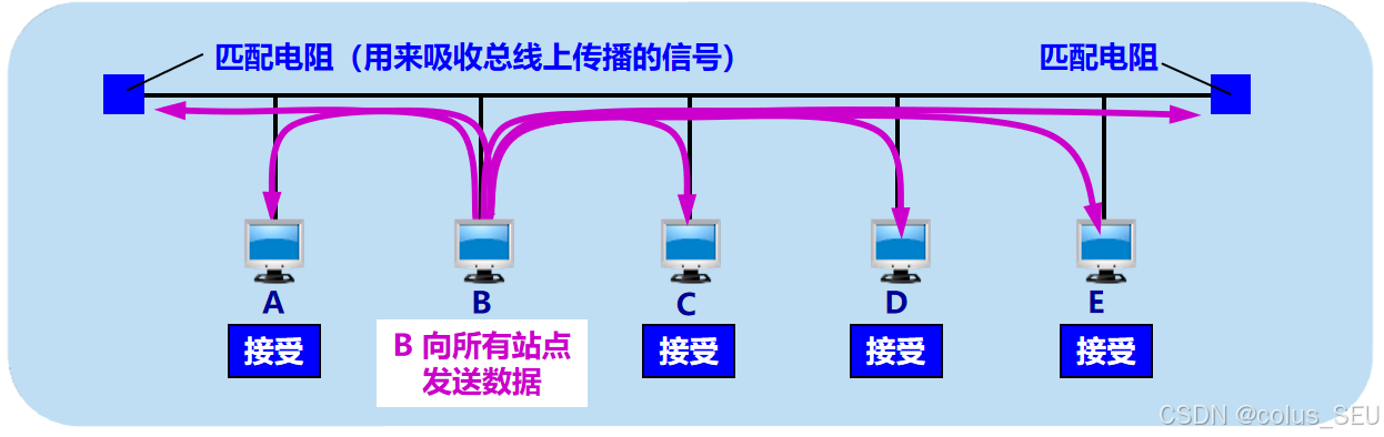 广播链路(Broadcast Links):多个节点连接到同一个共享信道。当一个节点发送数据时,所有其他节点都能收到。例如,传统的同轴电缆以太网、无线局域网(Wi-Fi)、卫星网络。