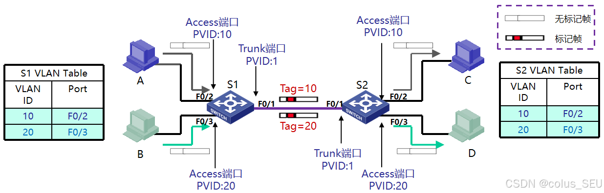 Access链路类型端口一般用于连接用户设备(无需识别802.1Q帧的设备),一旦Access端口加入了特定的VLAN,连接在该端口的设备被视为属于该VLAN。
