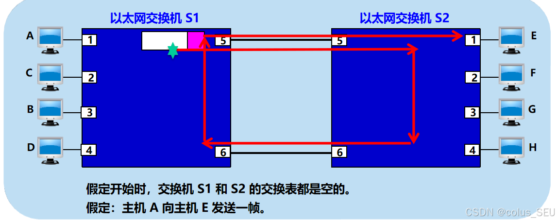 例如:下图中主机A向E发送一帧,从星号位置开始,先广播经一个循环使两个交换机的交换表中有相关信息后,该帧才能发送到主机E。但是在广播的时候会发生回路问题。