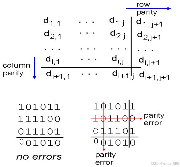作用:检测和纠正单个位的错误。单个比特错误会导致某一行和某一列的校验同时出错,错误比特的位置就是行和列的交点,可以直接纠正。