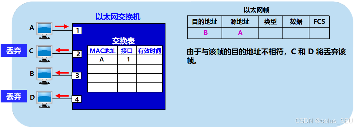 交换机对广播帧的转发规则是 “泛洪” flood:交换机收到广播帧(目标 MAC 为 FF-FF-FF-FF-FF-FF)时,会向除接收端口外的所有其他端口发送该帧。