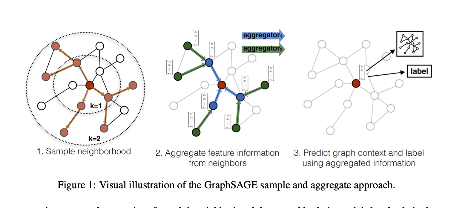 GraphSAGE提出了一种通用的归纳式(inductive)框架,通过利用节点特征信息(如文本属性)高效地为未见数据生成节点嵌入。与为每个节点单独训练嵌入不同,该方法学习一个生成函数,通过采样并聚合节点局部邻域的特征来动态生成嵌入。