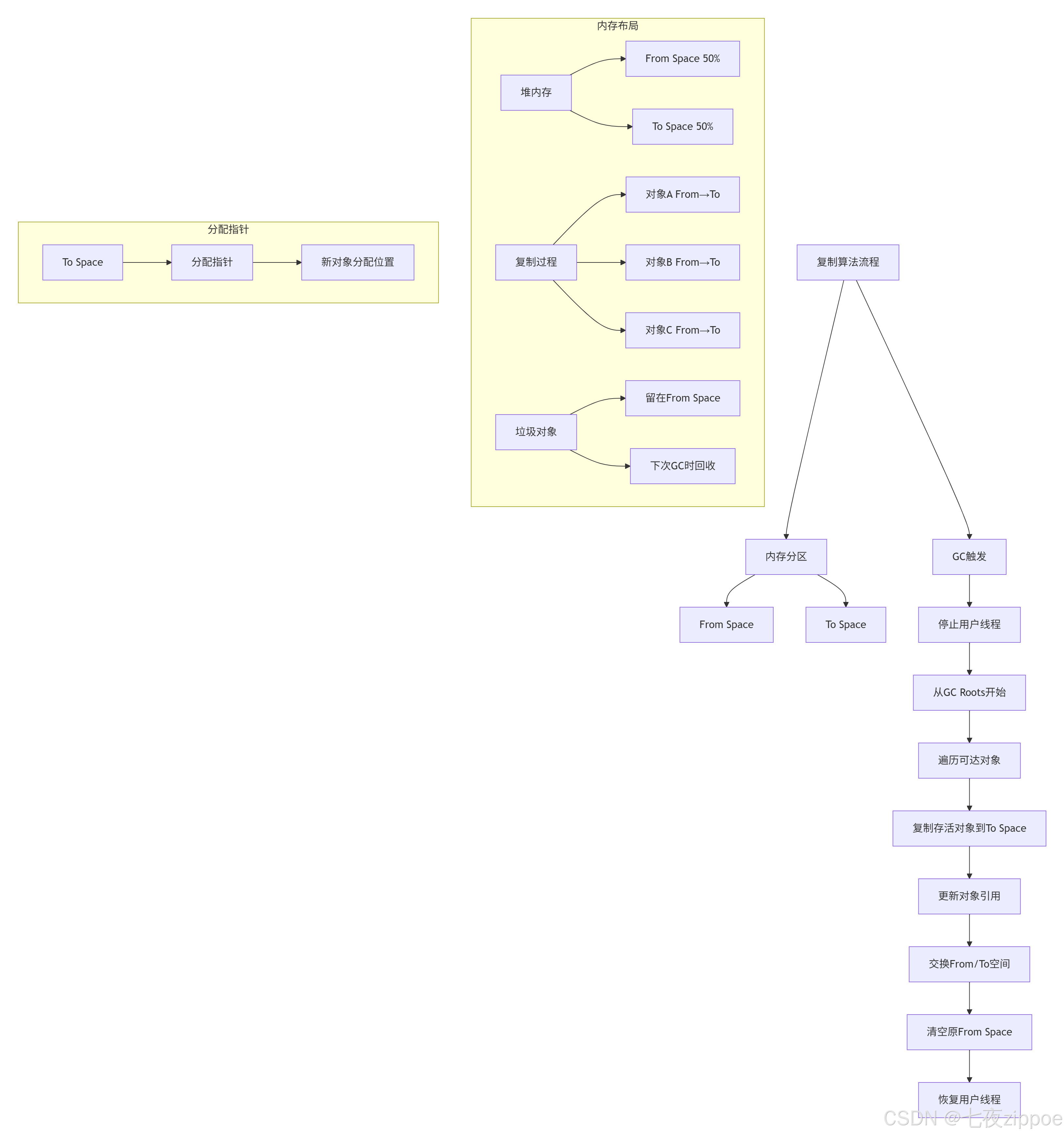 public class CopyingGC {// 堆内存分区管理public class CopyingHeap {private final byte[] fromSpace;private final byte[] toSpace;private boolean usingFromSpace = true;private int fromAllocPtr = 0;private int toAllocPtr = 0;private final int spaceSize;public CopyingHeap(int totalSize) {this.spaceSize = totalSize / 2;this.fromSpace = new byte[spaceSize];this.toSpace = new byte[spaceSize];}// 获取当前使用的空间public byte[] getCurrentSpace() {return usingFromSpace ? fromSpace : toSpace;}public int getAllocPointer() {return usingFromSpace ? fromAllocPtr : toAllocPtr;}// 对象分配(指针碰撞)public Integer allocate(int size) {byte[] currentSpace = getCurrentSpace();int allocPtr = getAllocPointer();if (allocPtr + size > spaceSize) {return null; // 空间不足,触发GC}int address = allocPtr;setAllocPointer(allocPtr + size);return address;}// 执行垃圾回收public void garbageCollect() {if (usingFromSpace) {copyFromTo(fromSpace, toSpace);usingFromSpace = false;toAllocPtr = 0; // 重置分配指针} else {copyFromTo(toSpace, fromSpace);usingFromSpace = true;fromAllocPtr = 0;}}}// 对象复制与引用更新public class ObjectCopier {private final Map<Integer, Integer> forwardMap = new HashMap<>();public void copyObjects(byte[] fromSpace, byte[] toSpace) {// 第一阶段:复制所有存活对象for (Object root : gcRoots) {copyObjectRecursive(root, fromSpace, toSpace);}// 第二阶段:更新所有引用updateReferences(toSpace);}private void copyObjectRecursive(Object obj, byte[] from, byte[] to) {if (obj == null || isAlreadyCopied(obj)) {return;}// 复制对象数据int fromAddress = getAddress(obj);int size = getObjectSize(obj);int toAddress = allocateInToSpace(size);// 复制内存内容System.arraycopy(from, fromAddress, to, toAddress, size);// 记录转发地址forwardMap.put(fromAddress, toAddress);// 递归复制引用对象for (Object ref : getReferences(obj)) {copyObjectRecursive(ref, from, to);}}// 更新引用地址private void updateReferences(byte[] toSpace) {for (int i = 0; i < toAllocPtr; i += getObjectSizeAt(i)) {updateObjectReferences(toSpace, i);}}private void updateObjectReferences(byte[] space, int address) {for (Reference ref : getReferencesAt(space, address)) {int oldAddress = ref.getTargetAddress();if (forwardMap.containsKey(oldAddress)) {ref.setTargetAddress(forwardMap.get(oldAddress));}}}}// 分配策略优化public class AllocationOptimization {// 指针碰撞(Bump Pointer)分配public class BumpPointerAllocator {private int pointer = 0;private final int limit;public Integer allocate(int size) {if (pointer + size > limit) {return null;}int addr = pointer;pointer += size;return addr;}// 优点:分配速度极快(O(1))// 缺点:需要紧凑的内存布局}// 半区大小与存活率关系public void spaceSizingAnalysis() {// 关键公式:存活对象大小 ≤ 半区大小// 如果存活率 > 50%,复制算法效率下降double survivalRate = calculateSurvivalRate();if (survivalRate > 0.5) {System.out.println("警告:存活率过高,复制算法效率低");}}}