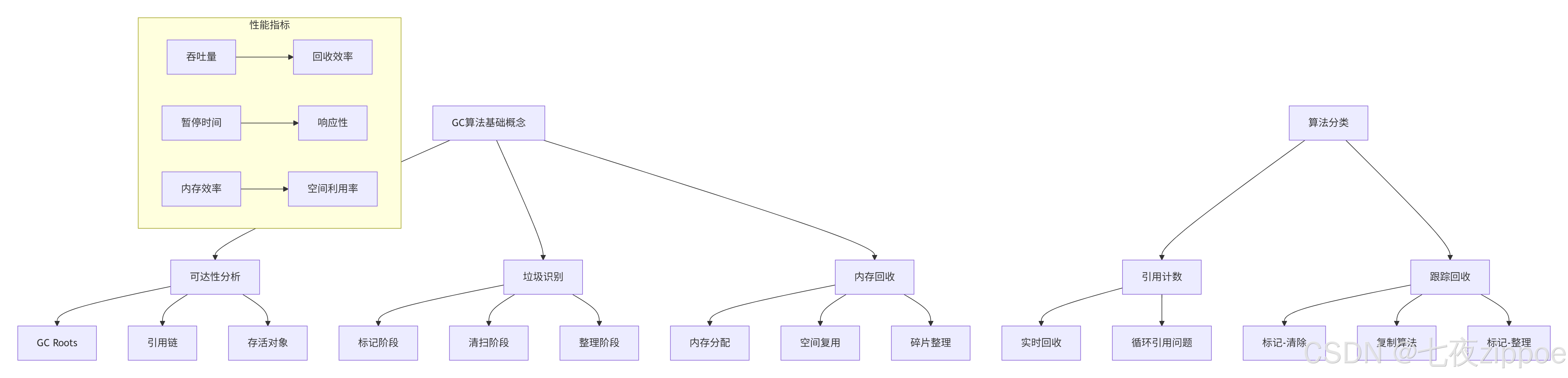 public class GCBasicConcepts {// 1. 可达性分析(Reachability Analysis)public class ReachabilityAnalyzer {// GC Roots集合:作为可达性分析的起点private final Set<Object> gcRoots = new HashSet<>();public void registerGCRoot(Object root) {gcRoots.add(root);}public boolean isReachable(Object obj) {// 从GC Roots开始遍历引用链return findPathToRoot(obj) != null;}private List<Object> findPathToRoot(Object obj) {// 使用深度优先搜索或广度优先搜索// 查找从对象到GC Roots的路径return dfsSearch(obj, new HashSet<>());}}// 2. 垃圾识别算法对比public class GarbageIdentification {// 方法1:引用计数(Reference Counting)public class ReferenceCounting {private int count = 0;public void addReference() {count++;}public void removeReference() {count--;if (count == 0) {cleanup(); // 引用为0时立即回收}}// 问题:循环引用无法回收public void circularReferenceProblem() {Object a = new Object();Object b = new Object();a.reference = b; // a引用bb.reference = a; // b引用a// 即使a和b都不可达,引用计数也不为0}}// 方法2:跟踪回收(Tracing GC)public class TracingGC {// 通过GC Roots遍历所有可达对象// 不可达对象即为垃圾public Set<Object> findGarbage(Set<Object> allObjects) {Set<Object> reachable = findReachableObjects();Set<Object> garbage = new HashSet<>(allObjects);garbage.removeAll(reachable);return garbage;}}}// 3. GC性能评估指标public class GCPerformanceMetrics {// 吞吐量(Throughput)public class ThroughputMetric {private long totalRuntime = 0;private long totalGCTime = 0;public double getThroughput() {return (double) (totalRuntime - totalGCTime) / totalRuntime;}// 目标:GC时间占比尽可能小(通常>95%)}// 暂停时间(Pause Time)public class PauseTimeMetric {private List<Long> pauseTimes = new ArrayList<>();public long getMaxPauseTime() {return pauseTimes.stream().max(Long::compare).orElse(0L);}public double getAveragePauseTime() {return pauseTimes.stream().mapToLong(Long::longValue).average().orElse(0.0);}// 目标:暂停时间尽可能短且稳定}// 内存效率(Footprint)public class MemoryEfficiency {private long heapSize;private long usedMemory;public double getMemoryUtilization() {return (double) usedMemory / heapSize;}// 目标:在有限内存内最大化利用效率}}