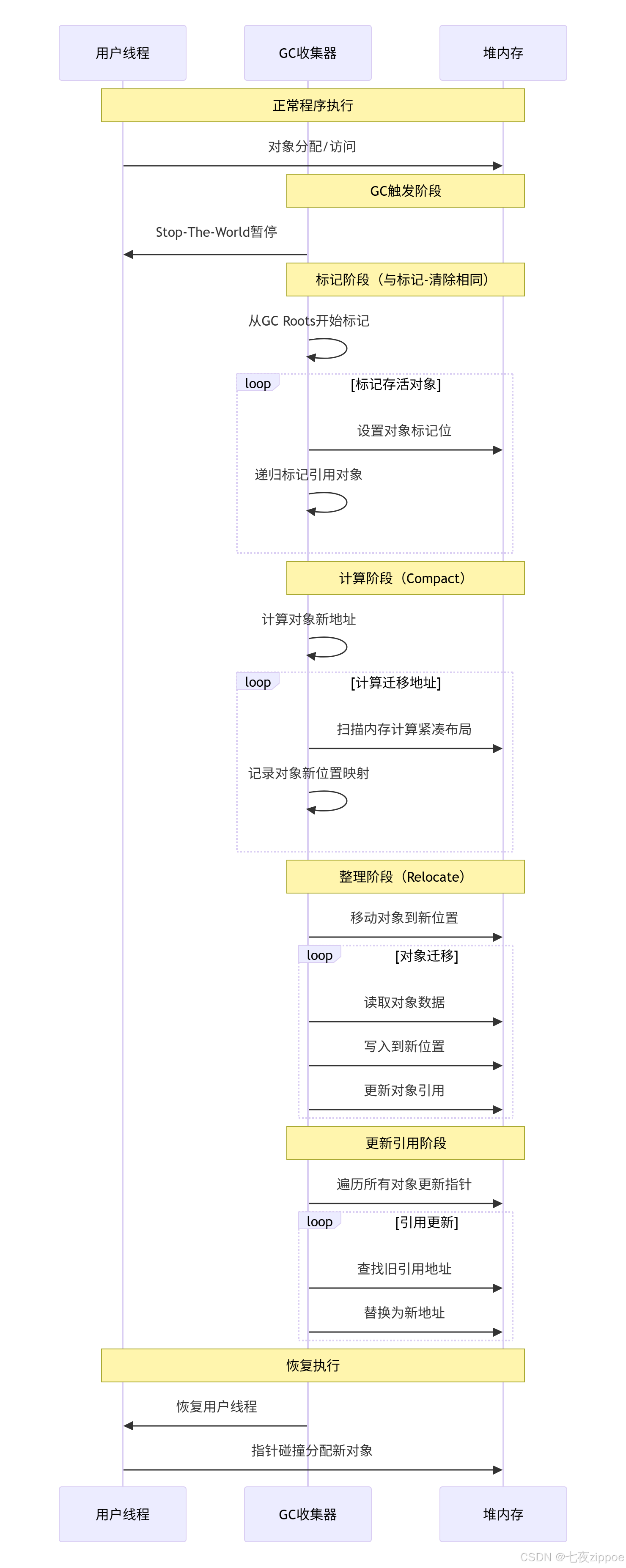 public class MarkCompactGC {// 三色标记法实现public class TricolorMarking {private static final int WHITE = 0; // 未访问(垃圾候选)private static final int GRAY = 1; // 已访问但引用未处理private static final int BLACK = 2; // 完全处理完成public void markWithTricolor() {// 初始所有对象为白色initializeAllWhite();// GC Roots设为灰色for (Object root : gcRoots) {setColor(root, GRAY);}// 处理灰色对象直到队列为空while (!graySet.isEmpty()) {Object current = graySet.remove();// 处理当前对象的引用for (Object ref : getReferences(current)) {if (getColor(ref) == WHITE) {setColor(ref, GRAY);graySet.add(ref);}}setColor(current, BLACK);}}}// 整理阶段核心算法public class CompactionAlgorithm {private final Map<Integer, Integer> forwardMap = new HashMap<>();// 方法1:双指针整理(Two-Finger Compaction)public void twoFingerCompaction() {int free = 0; // 空闲指针(从低地址开始)int scan = heapSize - 1; // 扫描指针(从高地址开始)// 第一阶段:计算对象新位置while (free < scan) {if (isObjectAt(free) && isMarked(free)) {// 存活对象,计算新位置int newAddr = calculateNewAddress(free);forwardMap.put(free, newAddr);free += getObjectSize(free);} else {// 找高地址的存活对象来填充while (scan > free && (!isObjectAt(scan) || !isMarked(scan))) {scan--;}if (scan > free) {// 移动高地址对象到低地址moveObject(scan, free);forwardMap.put(scan, free);free += getObjectSize(scan);scan--;}}}}// 方法2:滑动整理(Sliding Compaction)public void slidingCompaction() {int compactPointer = 0;// 计算每个存活对象的新地址for (int addr = 0; addr < heapSize; addr += getObjectSize(addr)) {if (isMarked(addr)) {forwardMap.put(addr, compactPointer);compactPointer += getObjectSize(addr);}}// 移动对象到新位置for (int addr = 0; addr < heapSize; addr += getObjectSize(addr)) {if (isMarked(addr)) {int newAddr = forwardMap.get(addr);if (newAddr != addr) {moveObject(addr, newAddr);}}}}// 方法3:线性整理(LISP2算法)public void lisp2Compaction() {// 三次遍历:计算新位置、更新引用、移动对象firstPassComputeAddresses();secondPassUpdateReferences();thirdPassMoveObjects();}}// 引用更新策略public class ReferenceUpdater {// 基于转发地址表的引用更新public void updateReferencesWithForwardMap() {for (int addr = 0; addr < heapSize; addr += getObjectSize(addr)) {if (isMarked(addr)) {updateObjectReferences(addr);}}}private void updateObjectReferences(int objectAddr) {for (Reference ref : getReferencesAt(objectAddr)) {int targetAddr = ref.getTargetAddress();if (forwardMap.containsKey(targetAddr)) {ref.setTargetAddress(forwardMap.get(targetAddr));}}}// 基于句柄的引用更新(避免大量指针更新)public class HandleBasedSystem {private final Map<Integer, Integer> handleTable = new HashMap<>();public void updateThroughHandles() {// 对象通过句柄间接引用// 移动对象时只需更新句柄表,引用保持不变for (Handle handle : getAllHandles()) {if (forwardMap.containsKey(handle.getObjectAddress())) {handle.setAddress(forwardMap.get(handle.getObjectAddress()));}}}}}