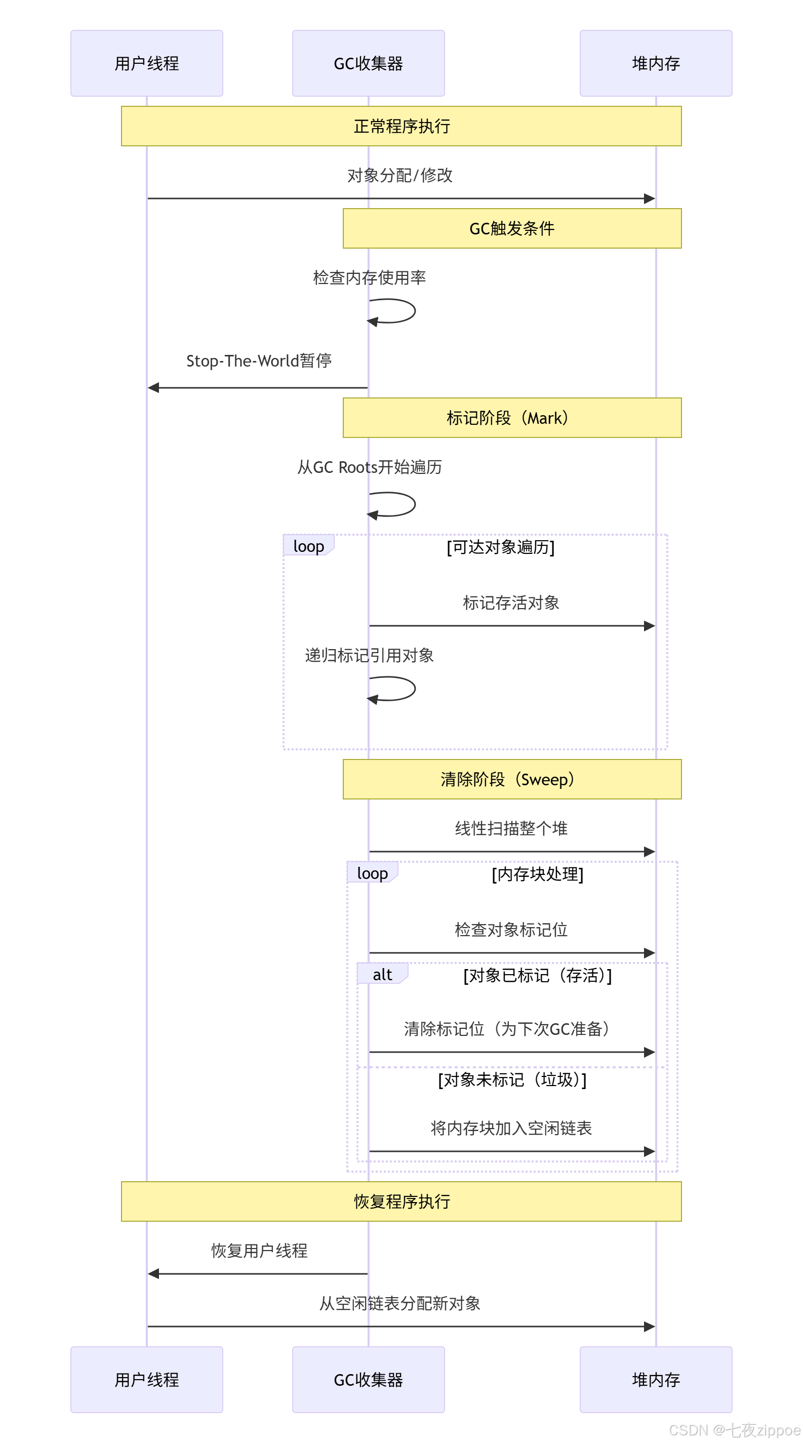 public class MarkSweepGC {// 堆内存管理public class HeapMemory {private final byte[] memory; // 连续内存块private final int objectHeaderSize = 8; // 对象头大小private final FreeList freeList; // 空闲内存链表// 对象头结构:标记位 + 大小信息private class ObjectHeader {boolean marked; // 标记位(存活/垃圾)int size; // 对象大小int type; // 对象类型}public HeapMemory(int size) {this.memory = new byte[size];this.freeList = new FreeList(0, size); // 初始整个堆为空闲}// 对象分配public Integer allocate(int size) {// 在空闲链表中寻找合适的内存块FreeBlock block = freeList.findFit(size + objectHeaderSize);if (block == null) {return null; // 分配失败}// 设置对象头setObjectHeader(block.address, size, false);// 分割剩余空间(如有)freeList.splitBlock(block, size + objectHeaderSize);return block.address + objectHeaderSize; // 返回对象数据区地址}}// 标记阶段实现public class MarkPhase {private final Set<Object> gcRoots;private final HeapMemory heap;public void mark() {// 从每个GC Root开始深度优先遍历for (Object root : gcRoots) {markRecursive(root);}}private void markRecursive(Object obj) {if (obj == null || isMarked(obj)) {return; // 已标记或空对象}// 标记当前对象setMarked(obj, true);// 递归标记引用对象for (Object reference : getReferences(obj)) {markRecursive(reference);}}// 标记栈实现(避免递归深度过大)public void markWithStack() {Stack<Object> stack = new Stack<>();// 初始将GC Roots入栈for (Object root : gcRoots) {if (!isMarked(root)) {setMarked(root, true);stack.push(root);}}// 栈式遍历while (!stack.isEmpty()) {Object current = stack.pop();for (Object ref : getReferences(current)) {if (ref != null && !isMarked(ref)) {setMarked(ref, true);stack.push(ref);}}}}}// 清除阶段实现public class SweepPhase {private final HeapMemory heap;private final FreeList freeList;public void sweep() {int address = 0;// 线性扫描整个堆内存while (address < heap.size()) {ObjectHeader header = heap.getHeader(address);if (header.marked) {// 存活对象:清除标记位(为下次GC准备)header.marked = false;address += header.size + heap.objectHeaderSize;} else {// 垃圾对象:合并连续空闲块int garbageSize = header.size + heap.objectHeaderSize;freeList.addFreeBlock(address, garbageSize);address += garbageSize;}}// 合并相邻空闲块(减少碎片)freeList.coalesce();}}// 空闲链表管理public class FreeList {private FreeBlock head;class FreeBlock {int address;int size;FreeBlock next;FreeBlock(int address, int size) {this.address = address;this.size = size;}}// 首次适应算法(First Fit)public FreeBlock findFit(int requiredSize) {FreeBlock current = head;FreeBlock prev = null;while (current != null) {if (current.size >= requiredSize) {// 找到合适块if (prev != null) {prev.next = current.next;} else {head = current.next;}return current;}prev = current;current = current.next;}return null; // 没有合适块}// 分割内存块public void splitBlock(FreeBlock block, int usedSize) {if (block.size > usedSize) {// 剩余空间足够,分割出新空闲块FreeBlock newBlock = new FreeBlock(block.address + usedSize, block.size - usedSize);addFreeBlock(newBlock);}}// 合并相邻空闲块public void coalesce() {FreeBlock current = head;while (current != null && current.next != null) {if (current.address + current.size == current.next.address) {// 合并相邻块current.size += current.next.size;current.next = current.next.next;} else {current = current.next;}}}}