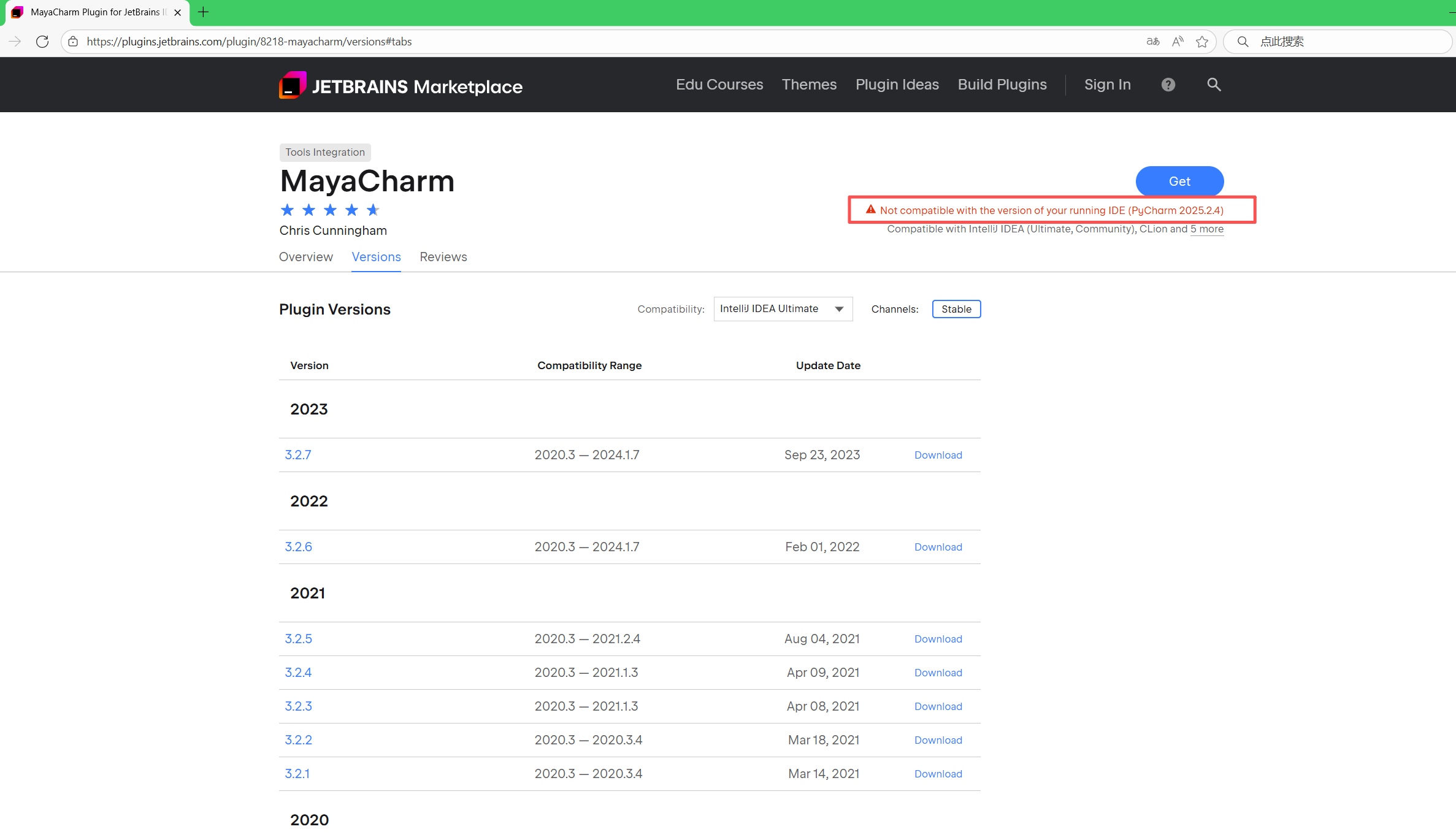 之前我用的是pycharm2025年版本的, 后面发现不支持mayacharm 插件 (2025.2版本的pycharm在插件那里搜索不到mayacharm插件,直接上官网搜插件发现原来是2025.2版本不支持)