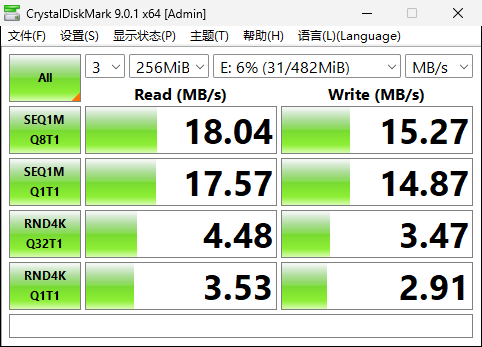 - SEQ1M Q8T1(连续 1MB 块,队列深度 8,线程 1):读取速度 18.04 MB/s,写入速度 15.27 MB/s;
