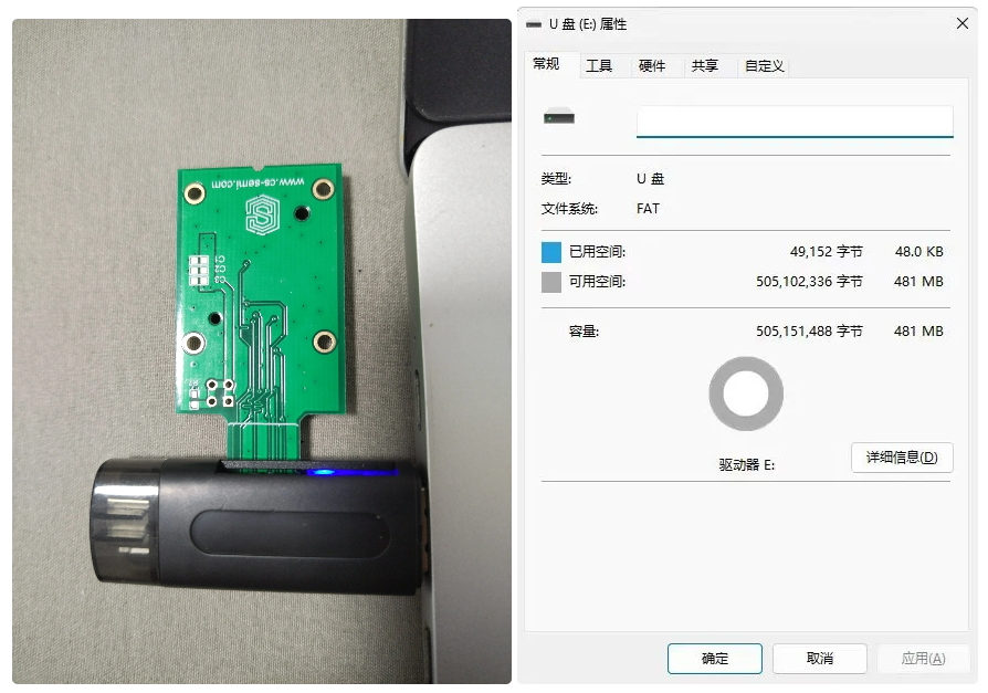 本次测试使用的是从雷龙发展申请的免费测试板。测试板上已经焊接好了 CSNP4GCR01-DPW 芯片。我们只需要将其插入到开发板的 TF 插槽或者使用读卡器接到电脑就可以很方便地使用了。