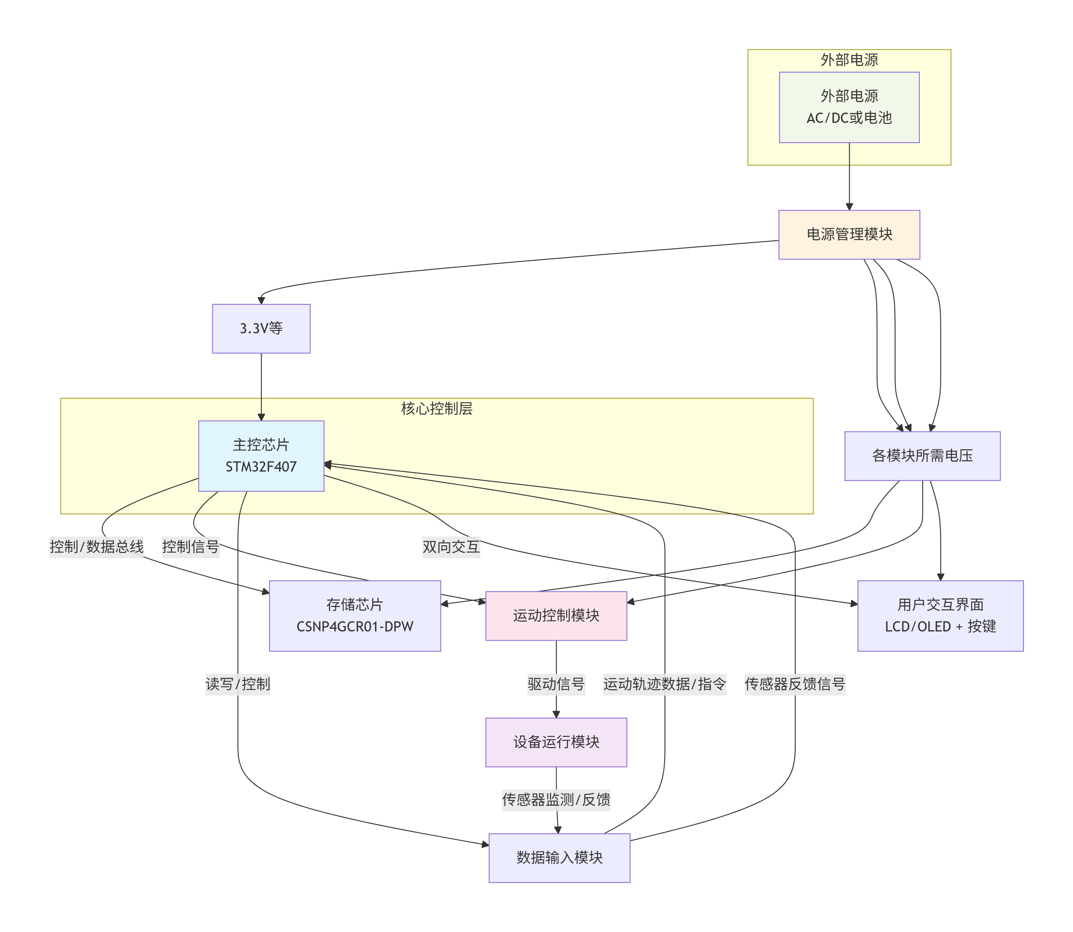- 设计电源转换电路,将外部电源(如交流电源或电池)转换为主控芯片、存储芯片、运动控制模块等各个部分所需的电压和电流。