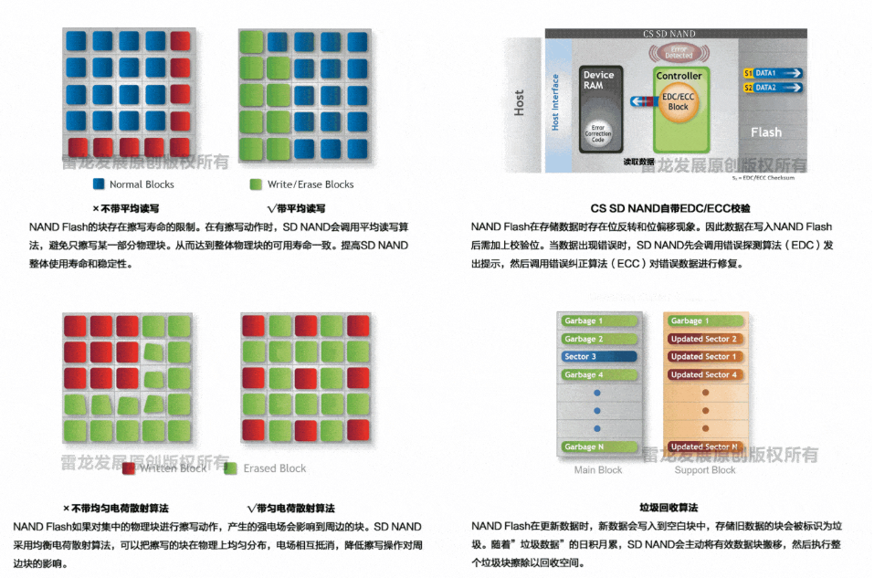 - 另一方面,针对 NAND Flash 存储数据时可能出现的位反转和位偏移现象,SD NAND 在数据写入后会添加校验位,并在检测到错误时,先通过错误探测算法(EDC)发出提示,随后利用错误纠正算法(ECC)对错误数据进行修复,有效保障数据的完整性和准确性。