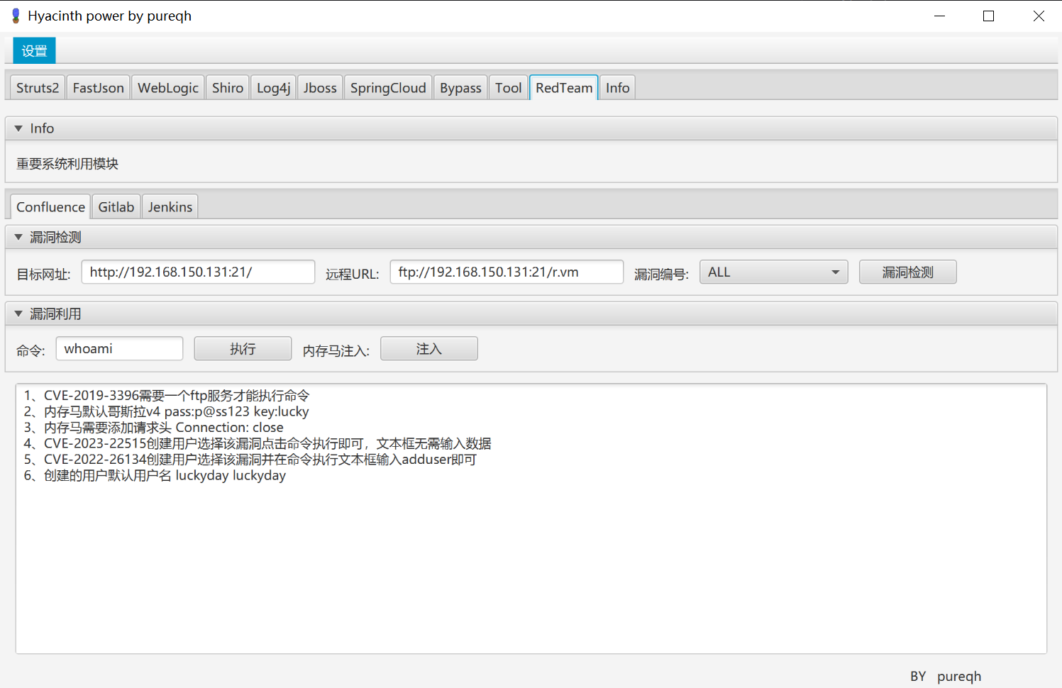 其中包含Struts2、Fastjson、Weblogic(xml)、Shiro、Log4j、Jboss、SpringCloud、等漏洞检测利用模块,及免杀webshell生成模块 Bypass、以及一些小工具模块等,由于图形化比较简明易懂,所以也不需要使用说明吧 。
